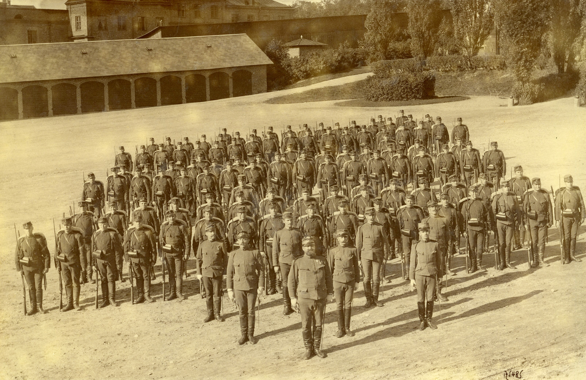 Förläggningen på Kungsholmen vid Hovjaktvarvet för Svea ingenjörkår. Kungl Svea ingenjörbataljons instruktionskompani 1890-91. Befälet "framför fronten": kapten Zethelius, löjtnant Enblom, löjtnant Thörnell, underlöjtnant de Champs. Fanjunkare Ågren, sergeanterna Carly, Selmander och Grönberg. Bilden tagen på kaserngården.