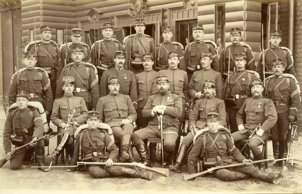 Förläggningen på Kungsholmen vid Hovjaktvarvet för Svea ingenjörkår. Befäl och underbefäl vid Kungl Svea ingenjörbataljons instruktionskompani 1890-91. Bakre raden 4:e fr v: officersaspirant Rabe, övriga okända. Mellersta raden fr v: ?, ?, ?, sergeanterna Grönberg, Selmander och Carly, distinktionskorpralerna Werner och Lindström. Främre raden fr v: underlöjtnant de Champs, löjtnant Enblom, kapten Zethelius, löjtnant Thörnell, fanjunkare Ågren. Sittande på marken: okända. Bilden tagen framför Stabsbyggnaden.