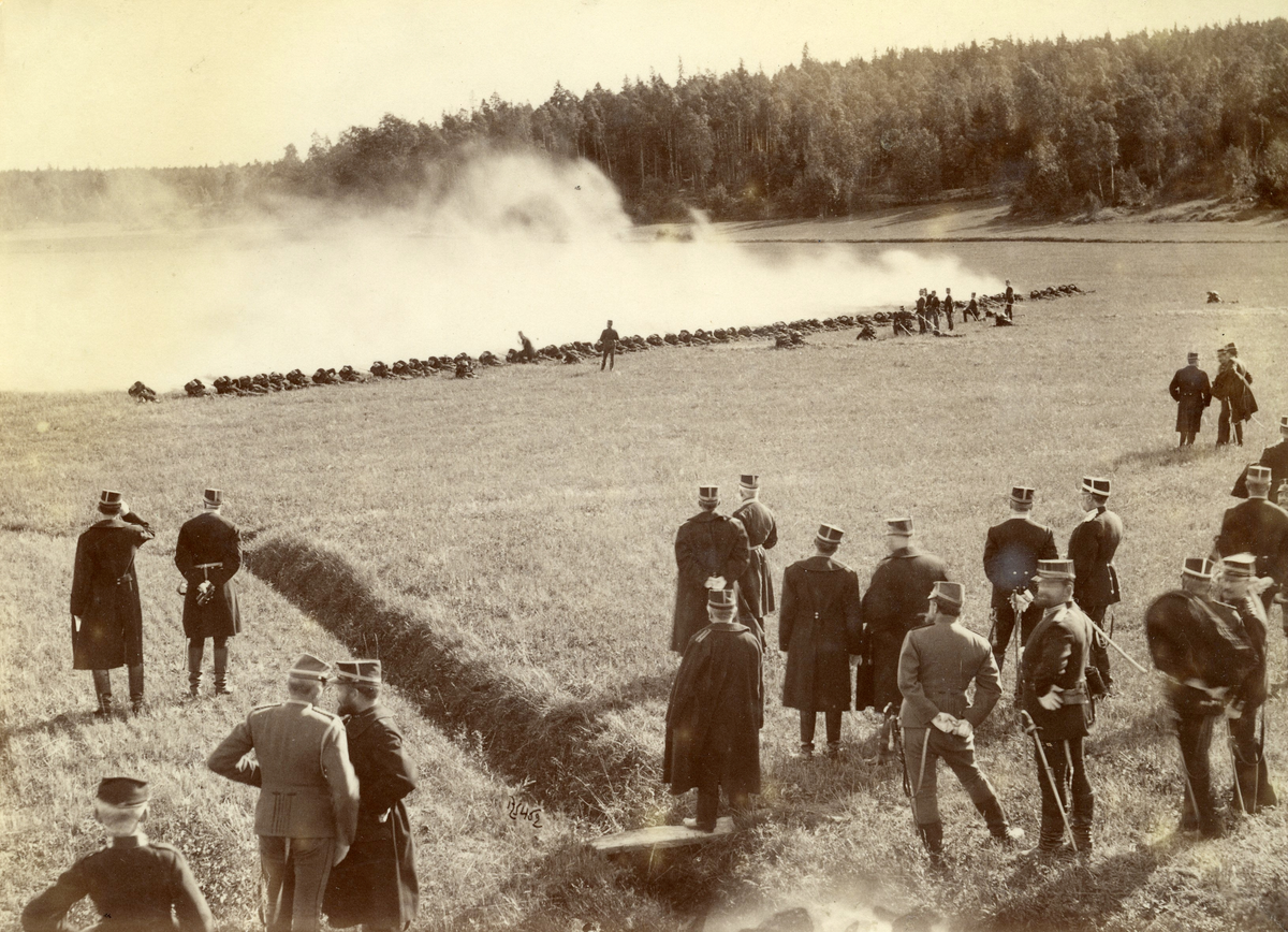 Kung Oscar II inspekterar fältskjutning med Svea ingenjörbataljon 1893. "Salva - lägg an - ge fyr!" Konungen i bildens mitt, längst fram mot truppen, med ryggen mot kameran.