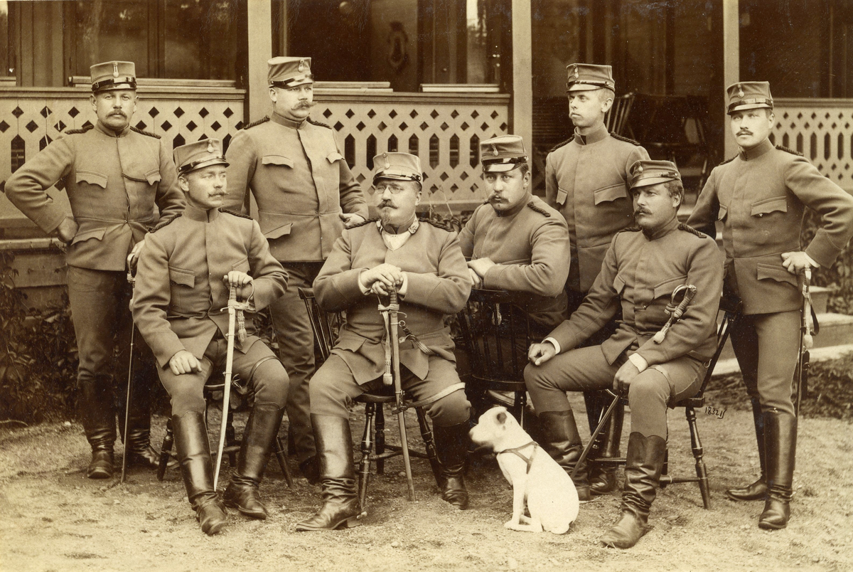 Laxön 1895. Underofficerare ur Ing 1 framför mässen. Fr v: Lindström, Roos, Söderberg, Örnmark, Norrlöw, Samuelsson, Carly, Eriksson.