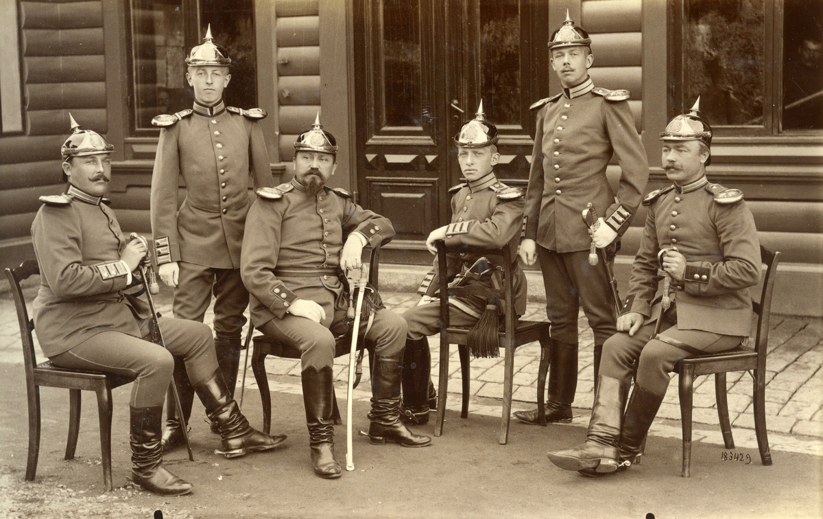 Förläggningen på Kungsholmen vid Hovjaktvarvet för Svea ingenjörkår. Underofficerskåren vid 3.kompaniet, Kungl Svea ingenjörbataljon, år 1895. Fr v Carly, ?, Condé, ?, ?, Roos. Bilden tagen framför Stabsbyggnaden.