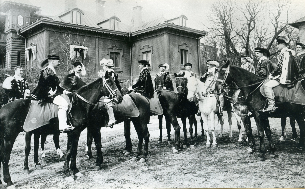 Förläggningen på Kungsholmen vid Hovjaktvarvet för Svea ingenjörkår. Grupp med ryttare utklädda i 1500-talskläder. Okänt sammanhang. I bakgrunden Stabsbyggnaden.