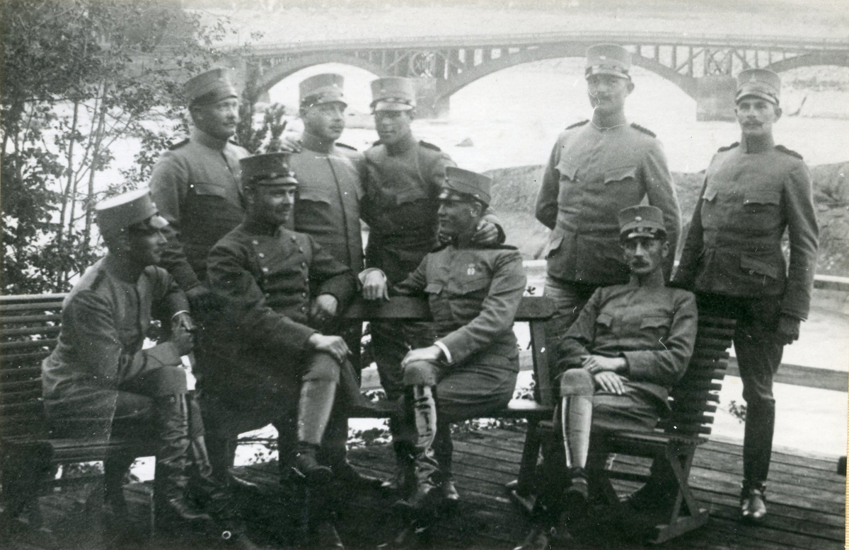 Svea ingenjörkår, Ing 1. Laxön (på "Turisten") 1913. Underofficerare på utflykt. Stående fr v: sergeanterna Brask, Crona, Mohme, Heij-Hejmar, P-son-Feraeus. Sittande fr v: sergeant Jansson, fanjunkare E-son-Ernelius, sergeanterna Ternbom och Kerslow. I bakgrunden Carl XIII:s bro.