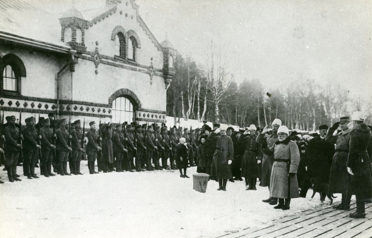Svea ingenjörkår, Ing 1. Demoleringsplutonen från Ing 1 anländer till Mariehamn (Åland) den 13 april 1919. en finsk paradpluton skyldrar, medan svenskarna stiger iland. Den finsk, f d ryske, generalen Schaumann i förgrunden.