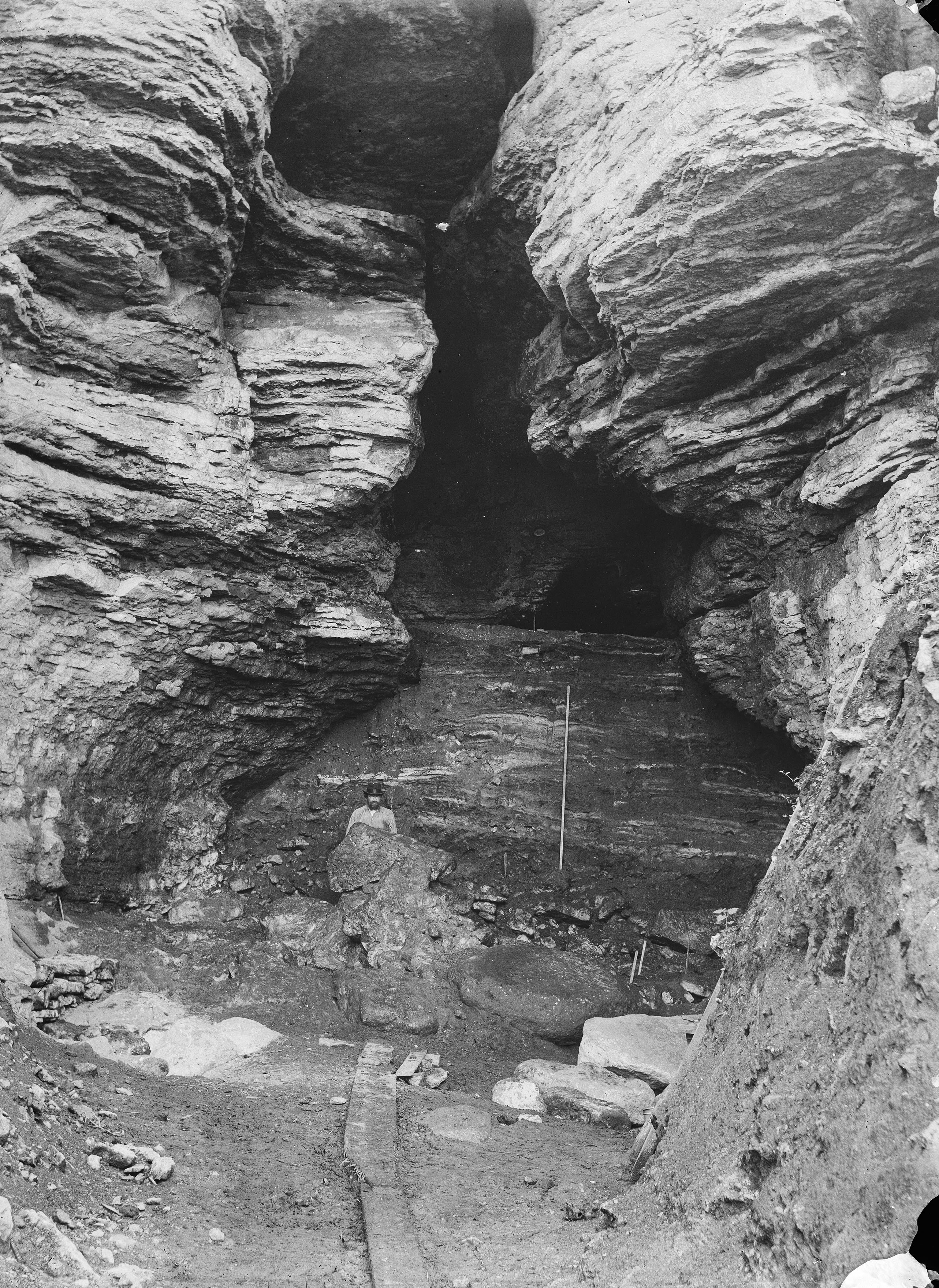 Beskrivning: Stora Karlsö, Stora förvar. En person står bakom en klippformation i grottan.