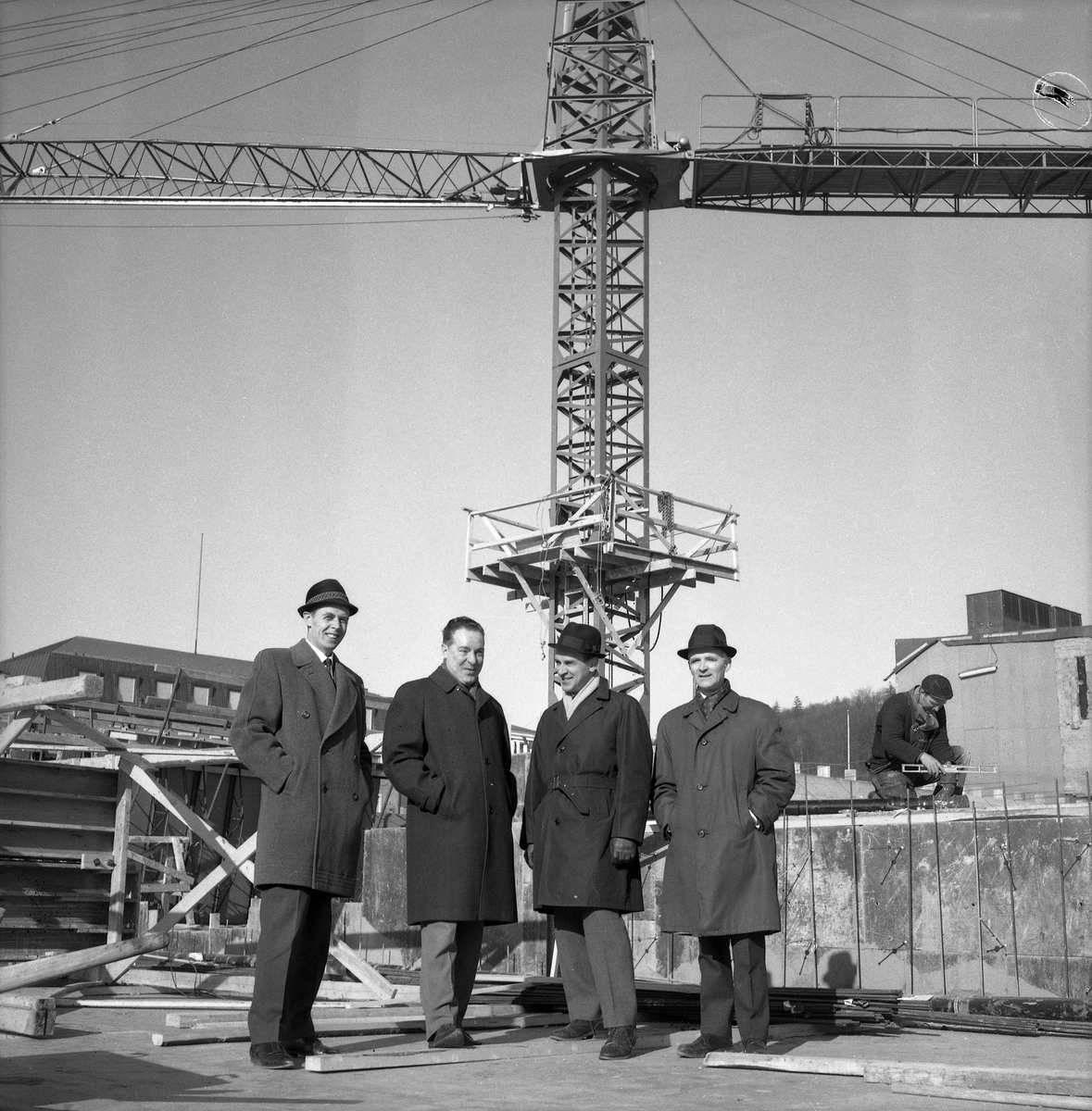 Fyra män står på taket till köpcentret Rosen och i bakgrunden ser man taket på det gamla stadshuset i Huskvarna.