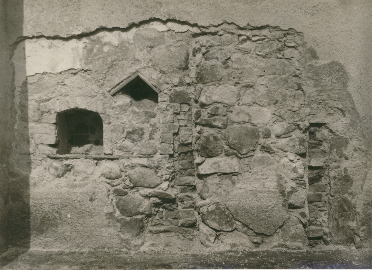 Ett murverk framträtt under putsen på Mortorps kyrka vid en arkeologisk undersökning. Två fönsteröppningar syns.