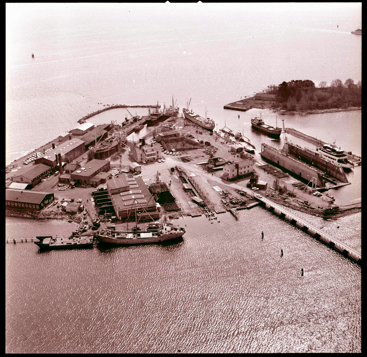 Varvsholmen från luften. Till höger i bild syns torrdockan tydligt. Den mindre ön är Laboratorieholmen.
