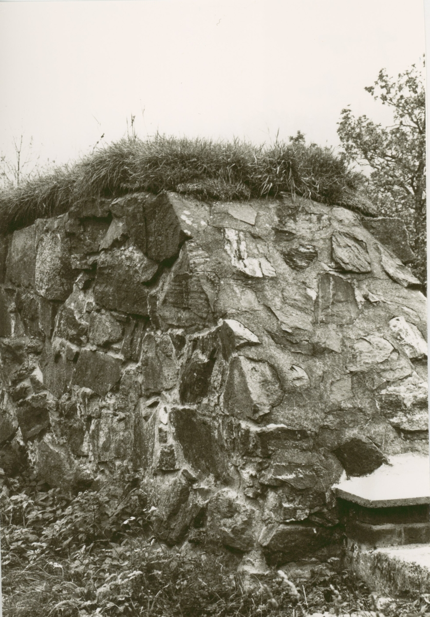 Omfogat murverk med ny torvtäckning för Ukna kyrkoruin.