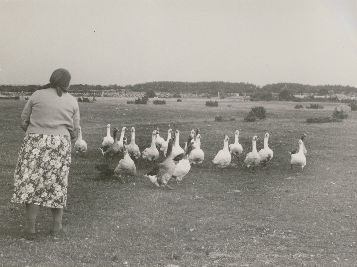 Kvinna med en flock gäss på alvaret.