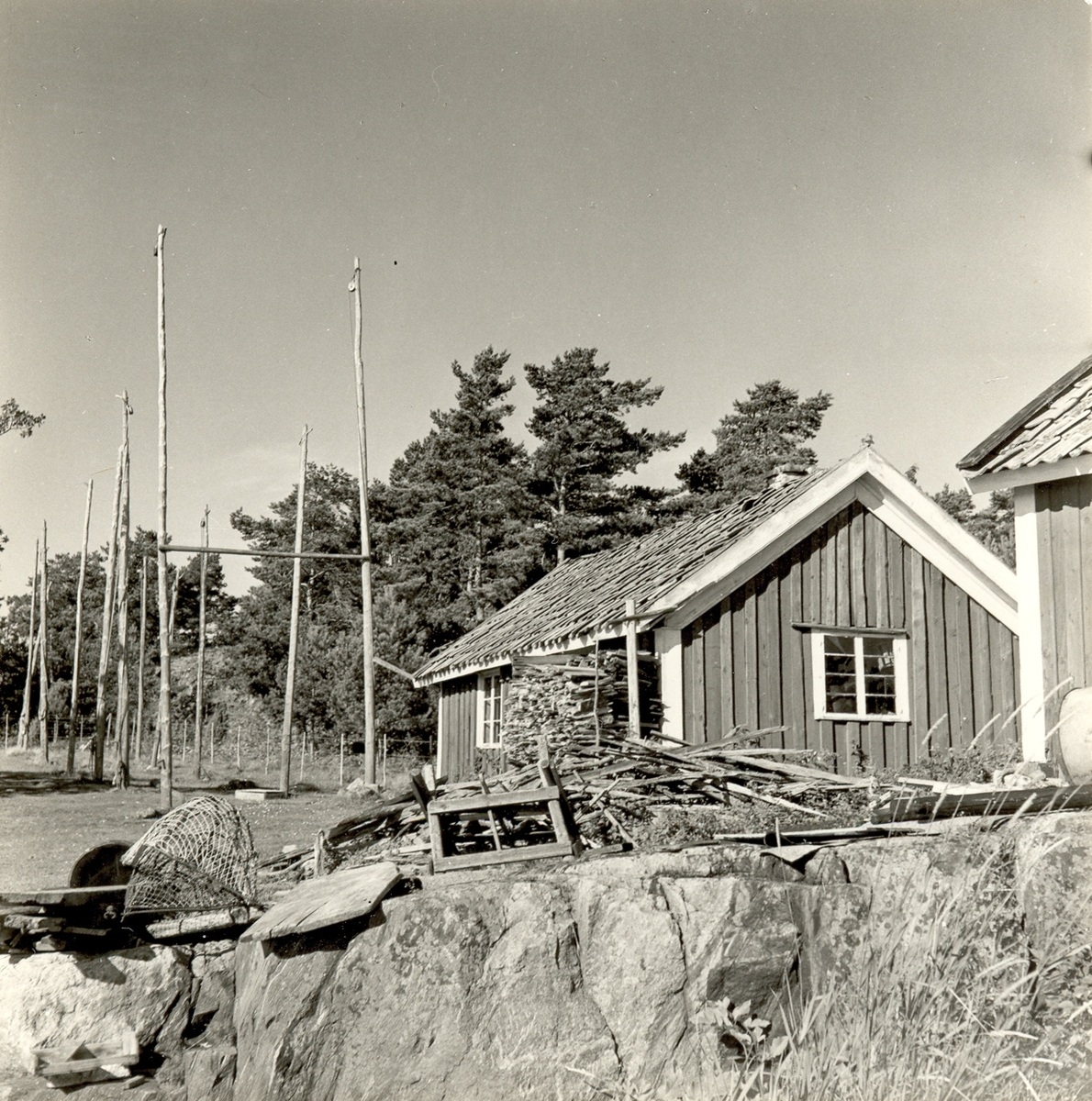 Edvin Perssons stuga. Till vänster en så kallad gista, som användes för att hänga upp fisknät på.