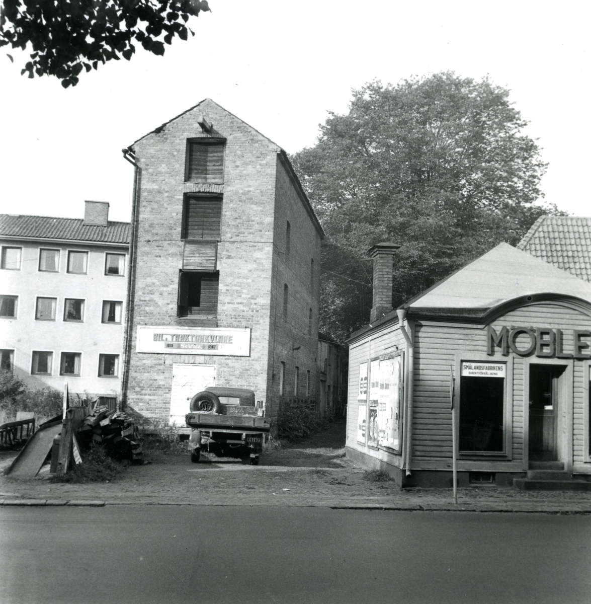 Kv. Beckasinen från Södra vägen. I bakgrunden syns KFUMs elevhem för gymnasiepojkar, färdigt 1949.