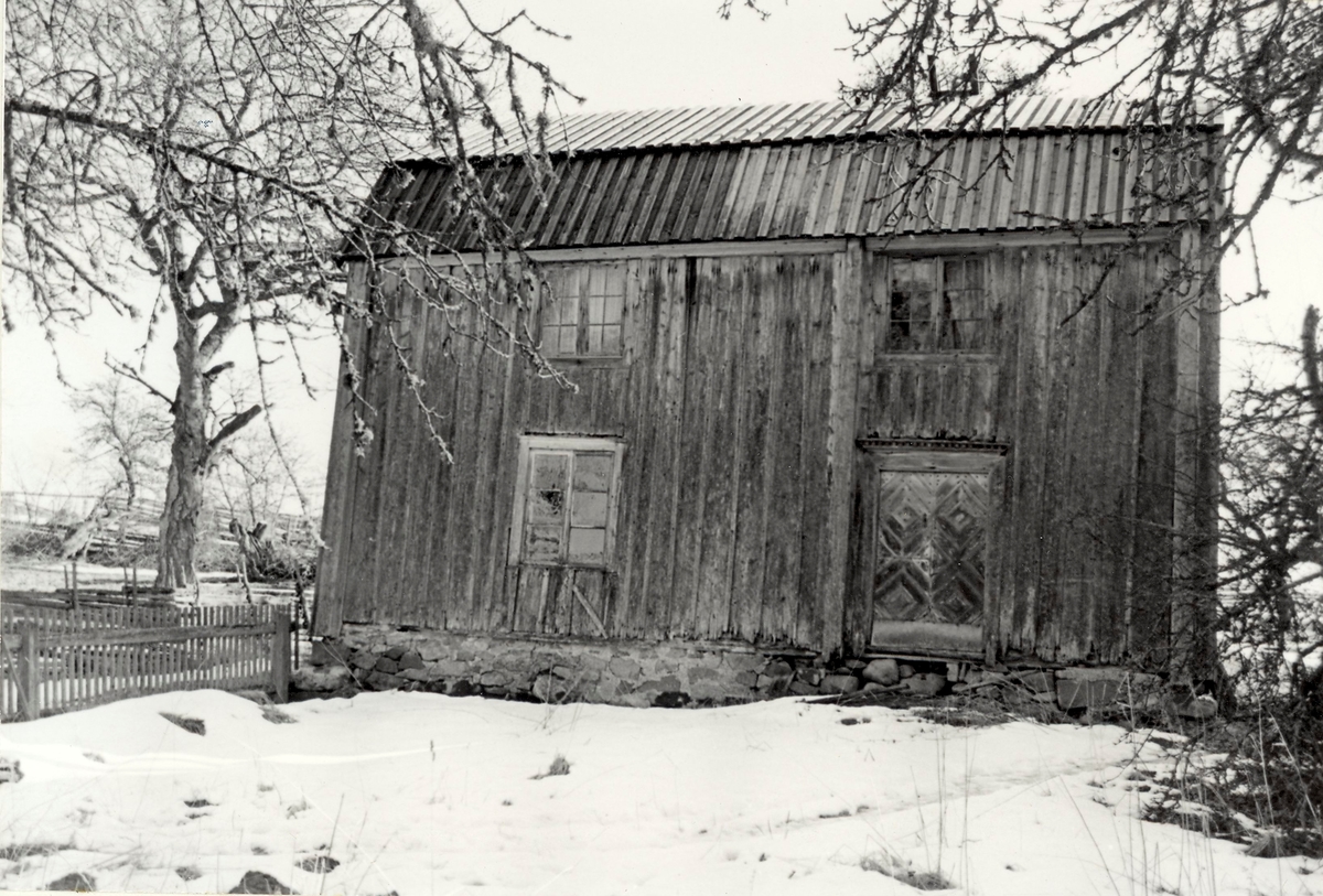 Tillbyggd knuttimmrad stuga med åstak av näver och trä.