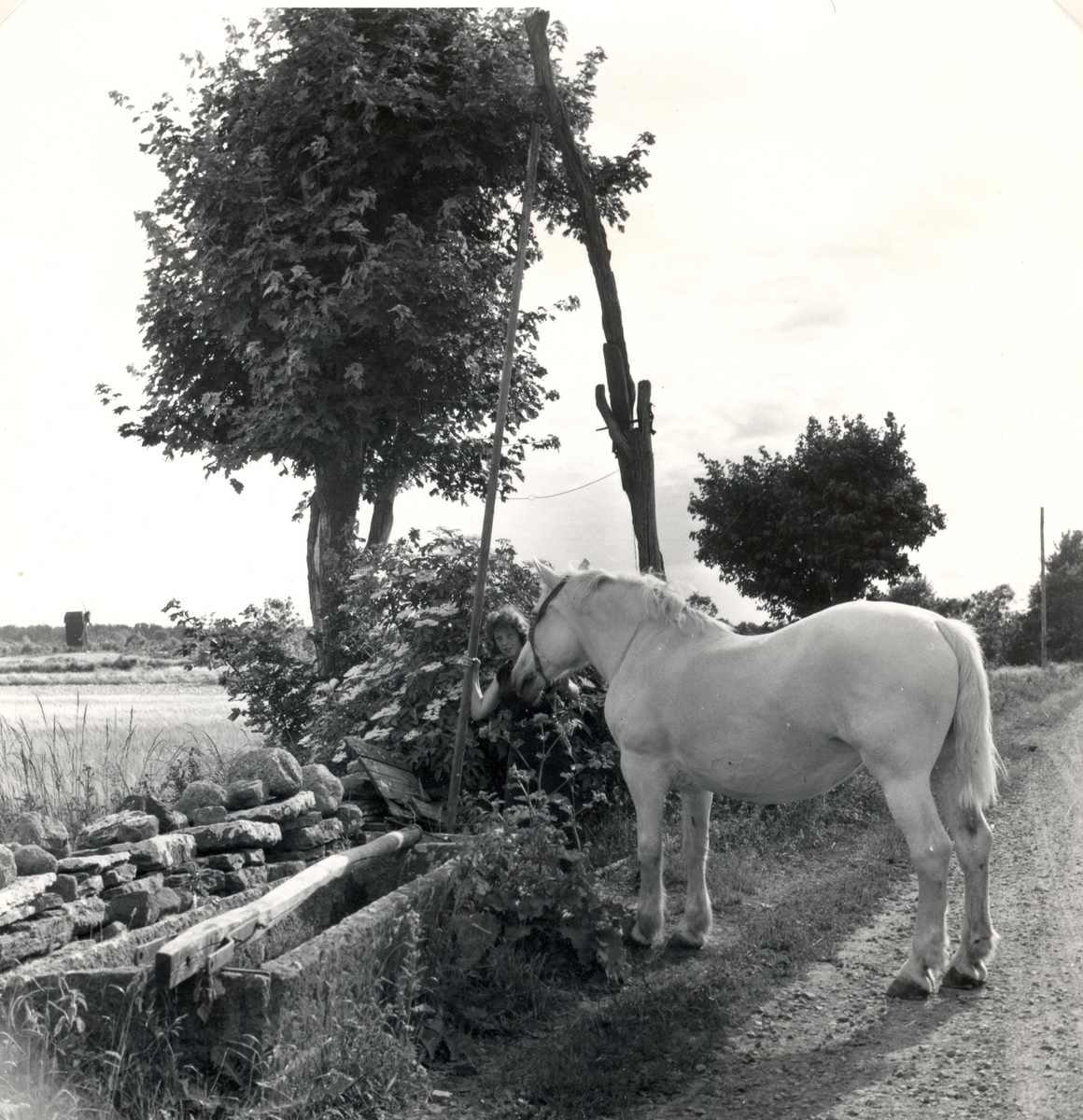 En häst vattnas vid brunnen.