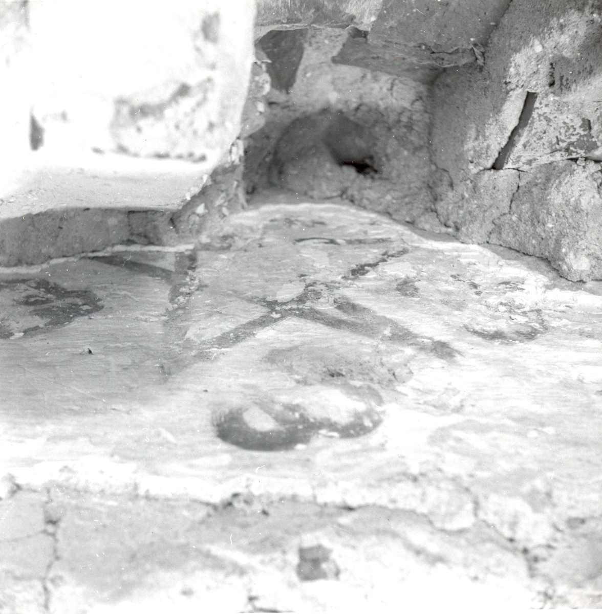 Voxtorps kyrka. Utgrävning av den medeltida kyrkan. Detalj av vägg i sandsten med konsekrationskors.