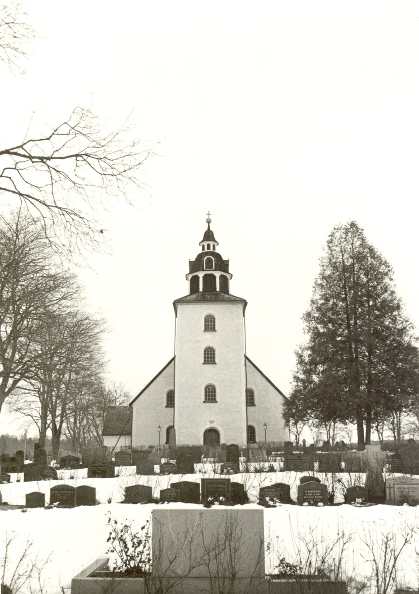 Vinterbild på Odensvi kyrka och kyrkogård.
