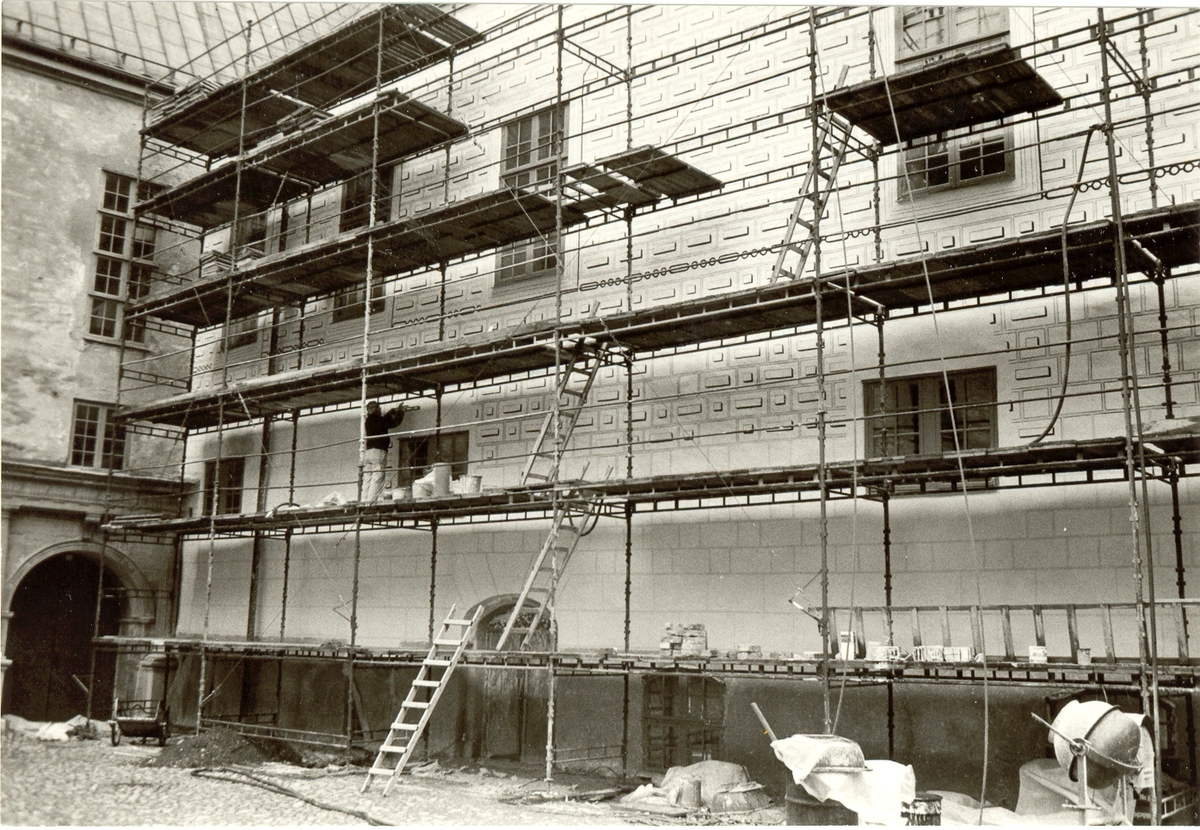 Dekoren restaureras på inre borggården på Kalmar slott.