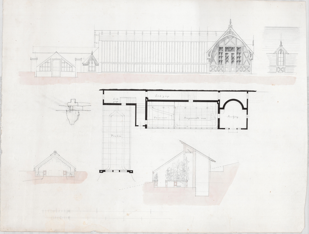 Kolorerad arkitektritning av Hugo Hammarskjöld. Projekt: Växthus Tobo Hoffmans ritning utan årtal. Inga uppgifter om den kom att uppföras.