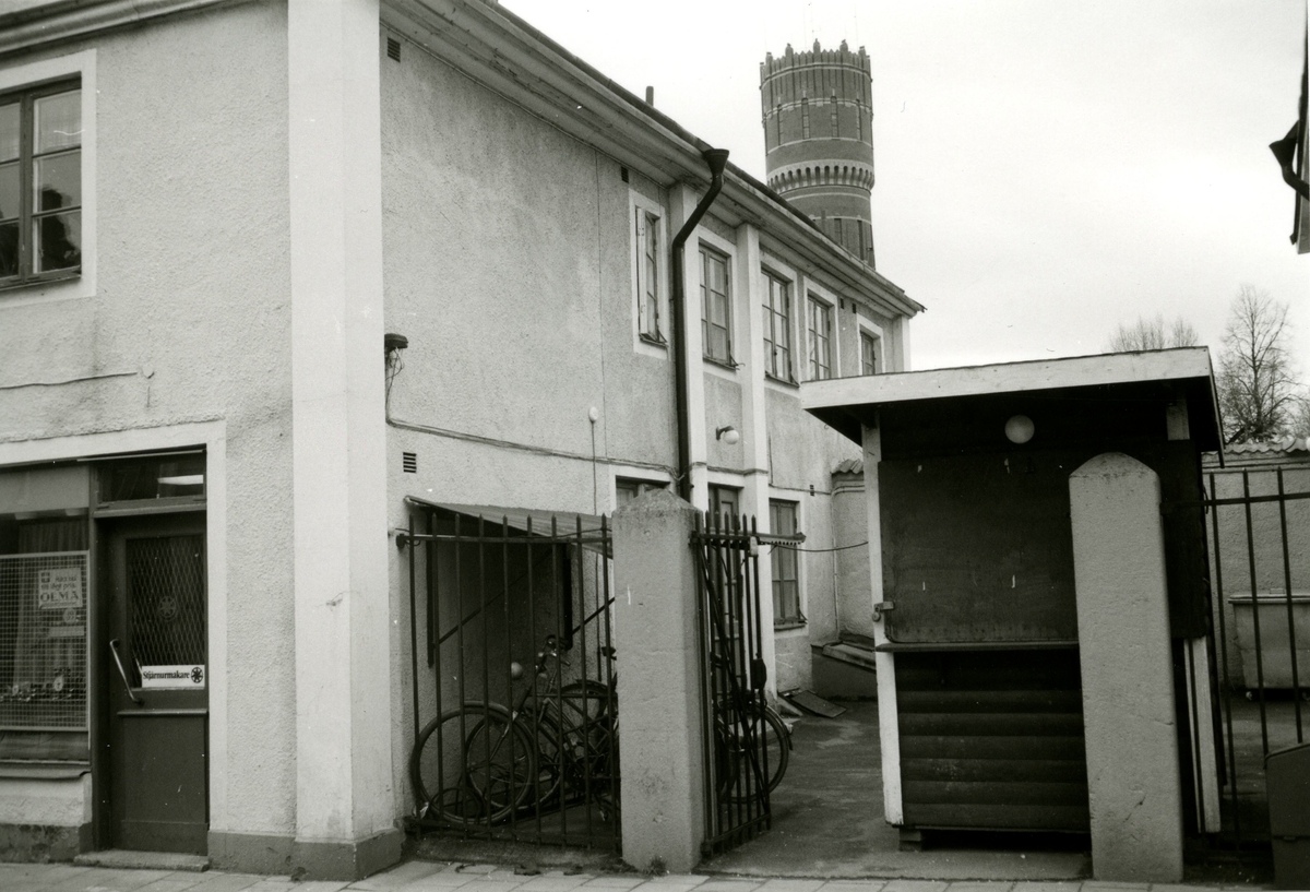 Port med järngrind till innergård, på Kaggensgatan i Kalmar. Till vänster i bild syns delvis en uraffär och till höger står en stängd lottkiosk.