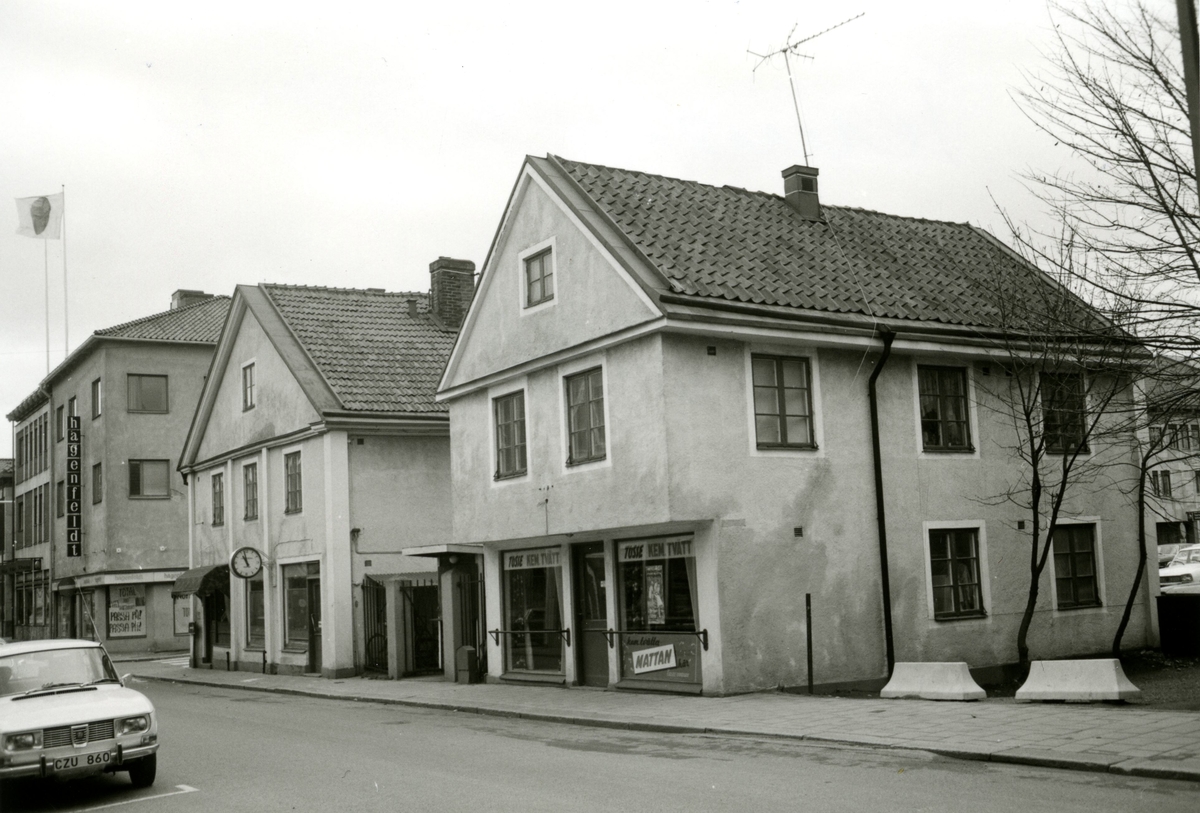 Kaggensgatan i Kalmar. Vi ser Hagenfeldts modebutik längst bort till vänster i bild, en uraffär i mitten och Tusses kemtvätt närmast i bild.