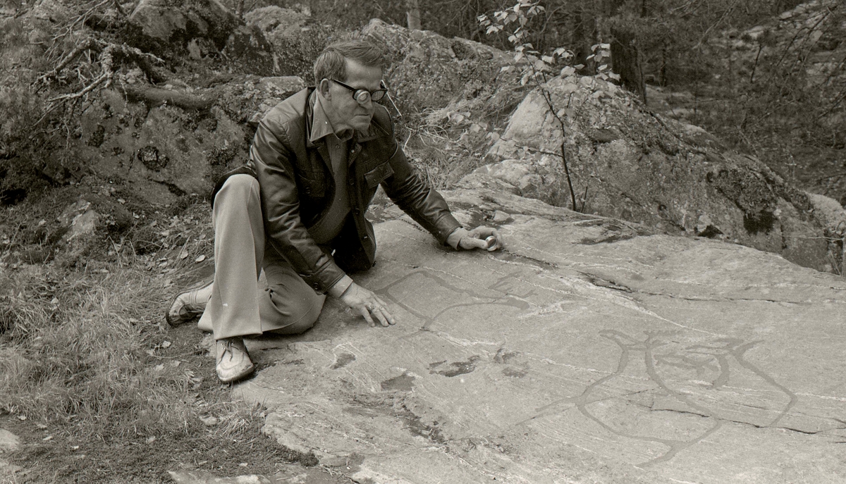 Bild från Hovåsristningen. En man studerar hällristningar som föreställer djur.