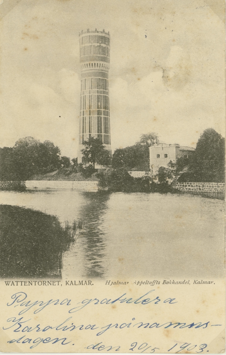 Vykort med motiv av gamla vattentornet. Under bilden står det: "Pappa gratulera Karolina på namnsdagen. den 20/5 1903."