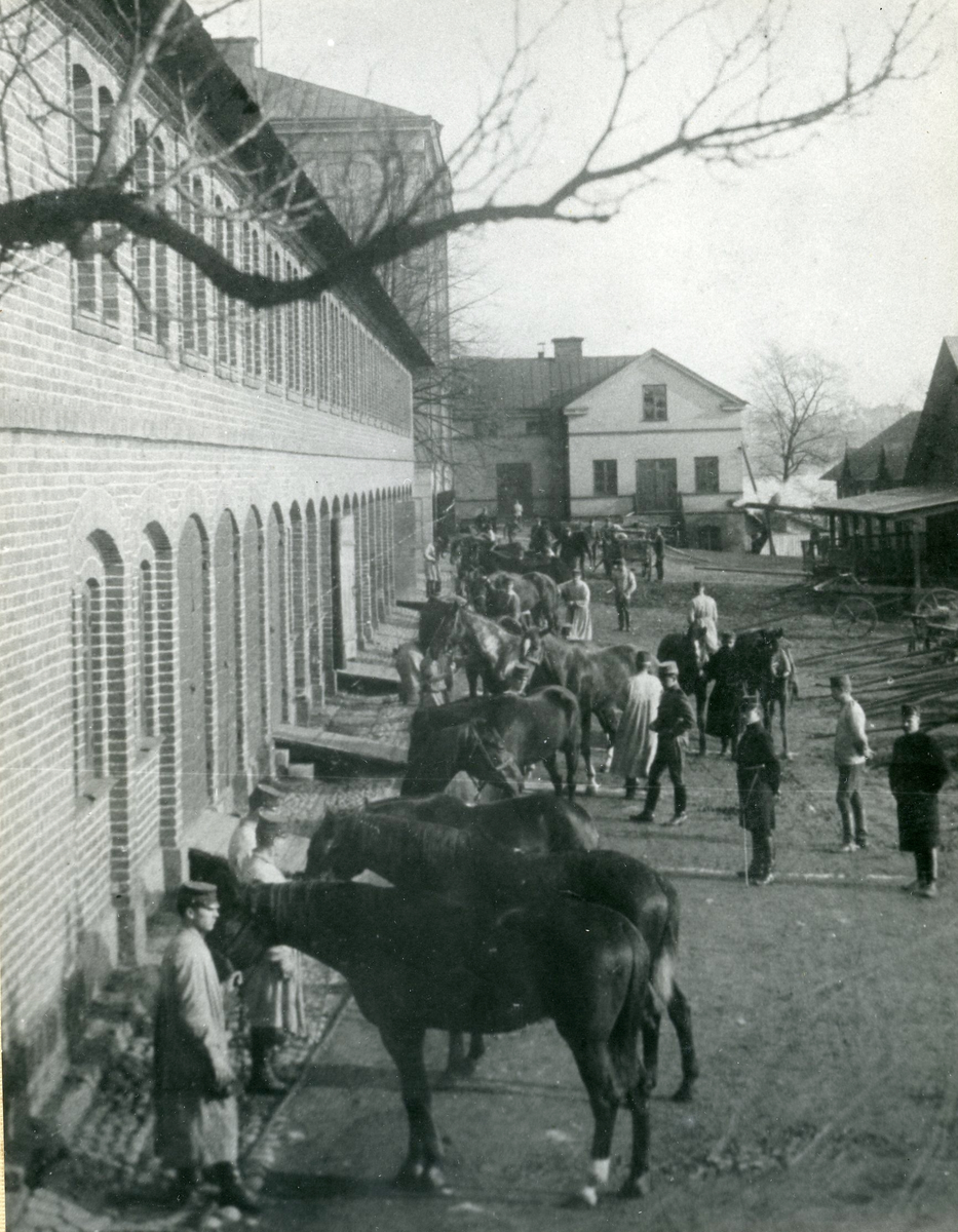 Förläggningen på Kungsholmen vid Hovjaktvarvet för Svea ingenjörkår. Stalltjänst. Till vänster stallbyggnaden. I bakgrunden förrådsbyggnader.