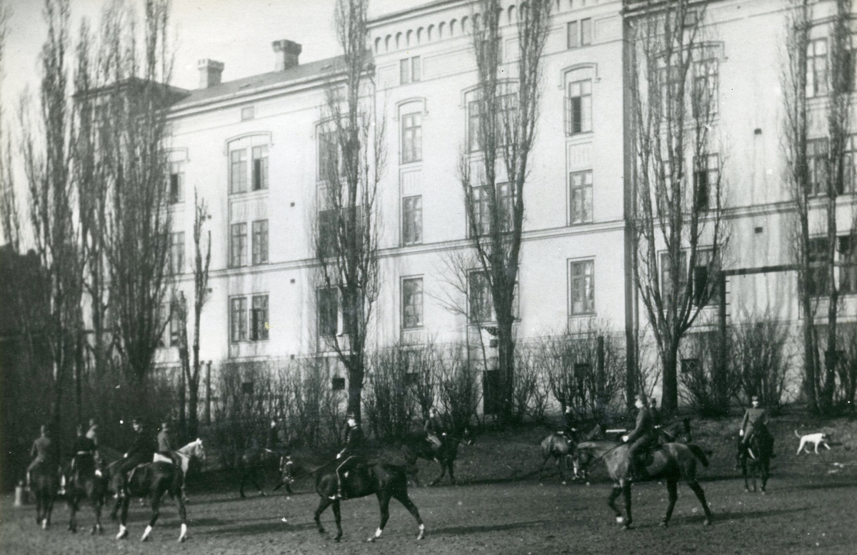 Förläggningen på Kungsholmen vid Hovjaktvarvet för Svea ingenjörkår. Foto från 1902. Officersridning framför Stora kasernen.