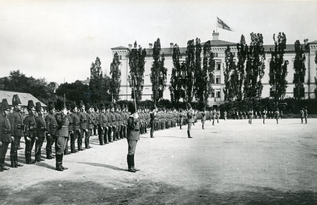 Förläggningen på Kungsholmen vid Hovjaktvarvet för Svea ingenjörkår. Stalltjänst. Foto från 1902. Generalmönstring. Överste Gustaf Stedt lämnar av de två kårerna till generalmönsterherren, överste Ludwig Munthe. Stora kasernen i bakgrunden.