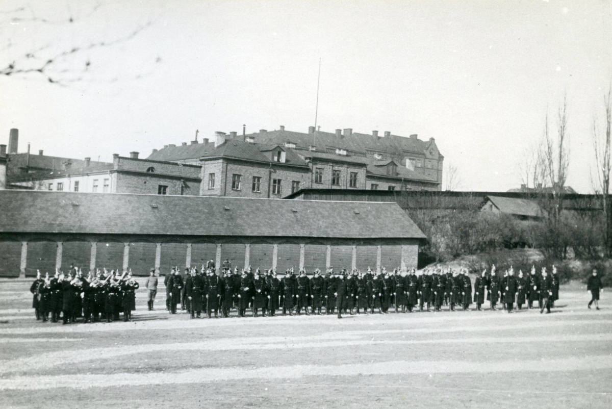 Förläggningen på Kungsholmen vid Hovjaktvarvet för Svea ingenjörkår. Stalltjänst. Tidigt 1900-tal. Högvakten klar att avmarschera. I bakgrunden pontonförrådet.