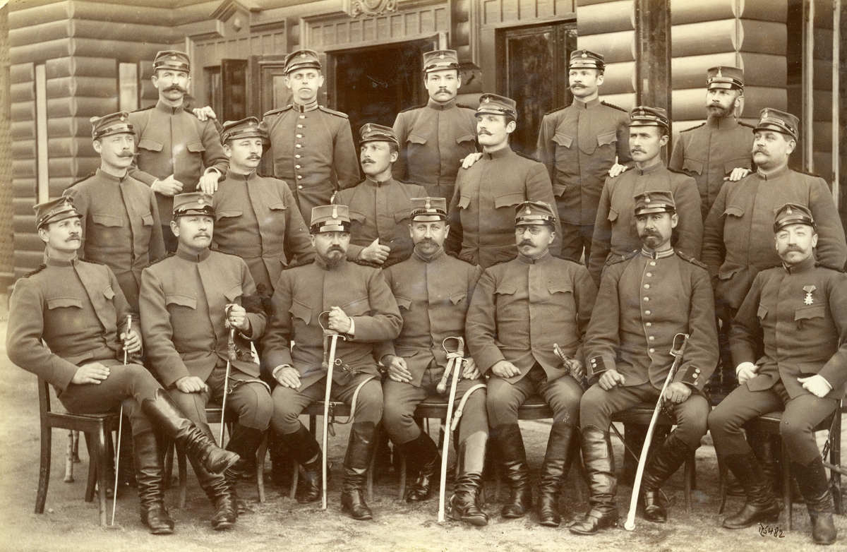 Förläggningen på Kungsholmen vid Hovjaktvarvet för Svea ingenjörkår. Underofficerare vid Kungl Pontonjärbataljonen år 1890. Bakre raden fr v: sergeanterna Cassel, Samuelsson, Daghlberg, Melin och Jäderlund. Mellersta raden fr v: sertgeanterna Bergman, Selmander, Carly, Johansson, Svensson och Blomgren. Främre raden fr v: sergeant Grönberg, fanjunkarna Tibbelin, Condé, Säfström, Örnmark, Ström och Ågren. Bilden tagen framför Stabsbyggnaden.
