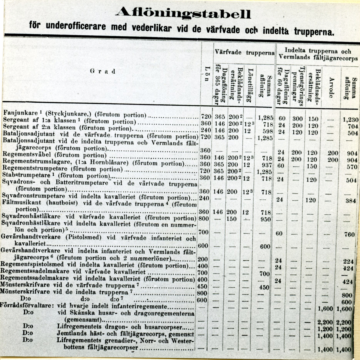 Förläggningen på Kungsholmen vid Hovjaktvarvet för Svea ingenjörkår. Avlöningstabell för underofficerare 1886.