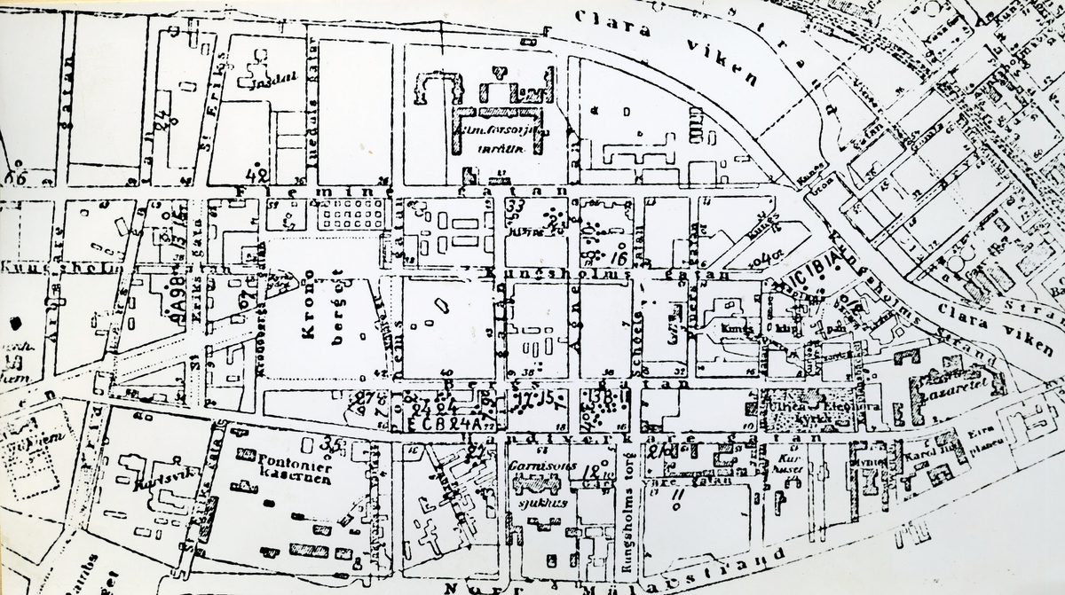 Förläggningen på Kungsholmen vid Hovjaktvarvet för Svea ingenjörkår. Utsnitt ur stadsplanekarta från c:a 1900.