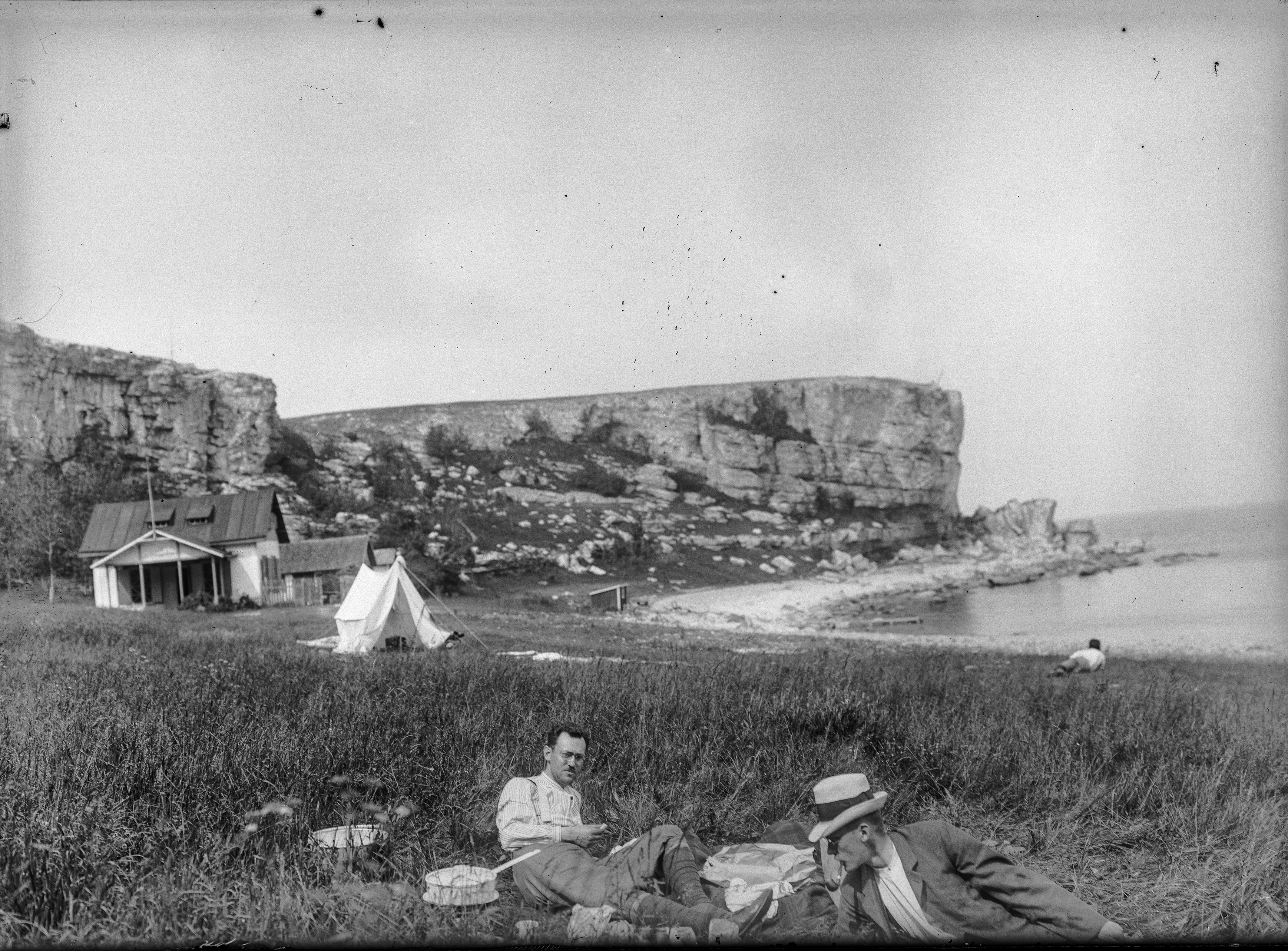 Beskrivning: Stora Karlsö 1912. Två män i förgrunden tillbakalutade på marken. I bakgrunden syns klippor, ett bostadshus, ett tält i bakgrunden och en person som ligger nära strandkanten.