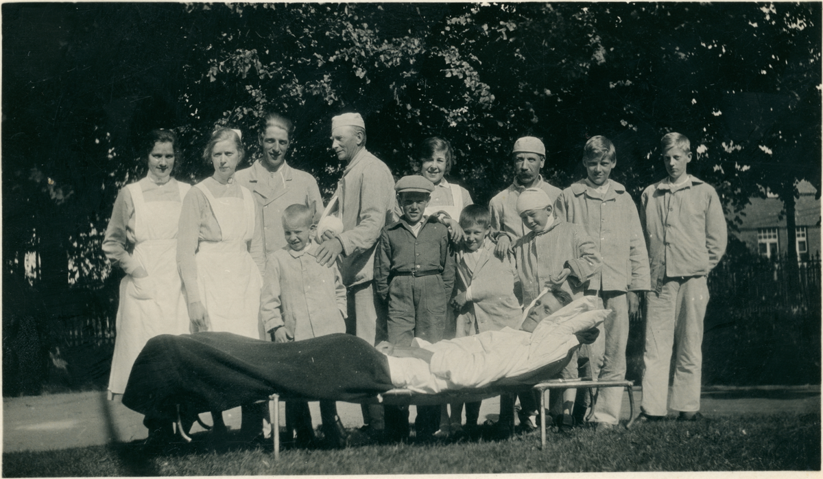 Gruppbild. Man på bår