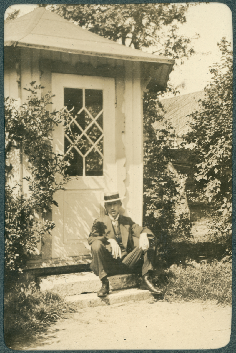 Man framför lusthus. Ser ut att vara Niklas Bergius