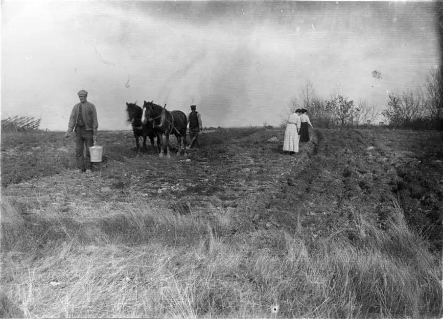 Bild 876. Majken, Maja u Halsrä-Hans, sättar pärår pa backän, Halsrä Vilhelm plögar
