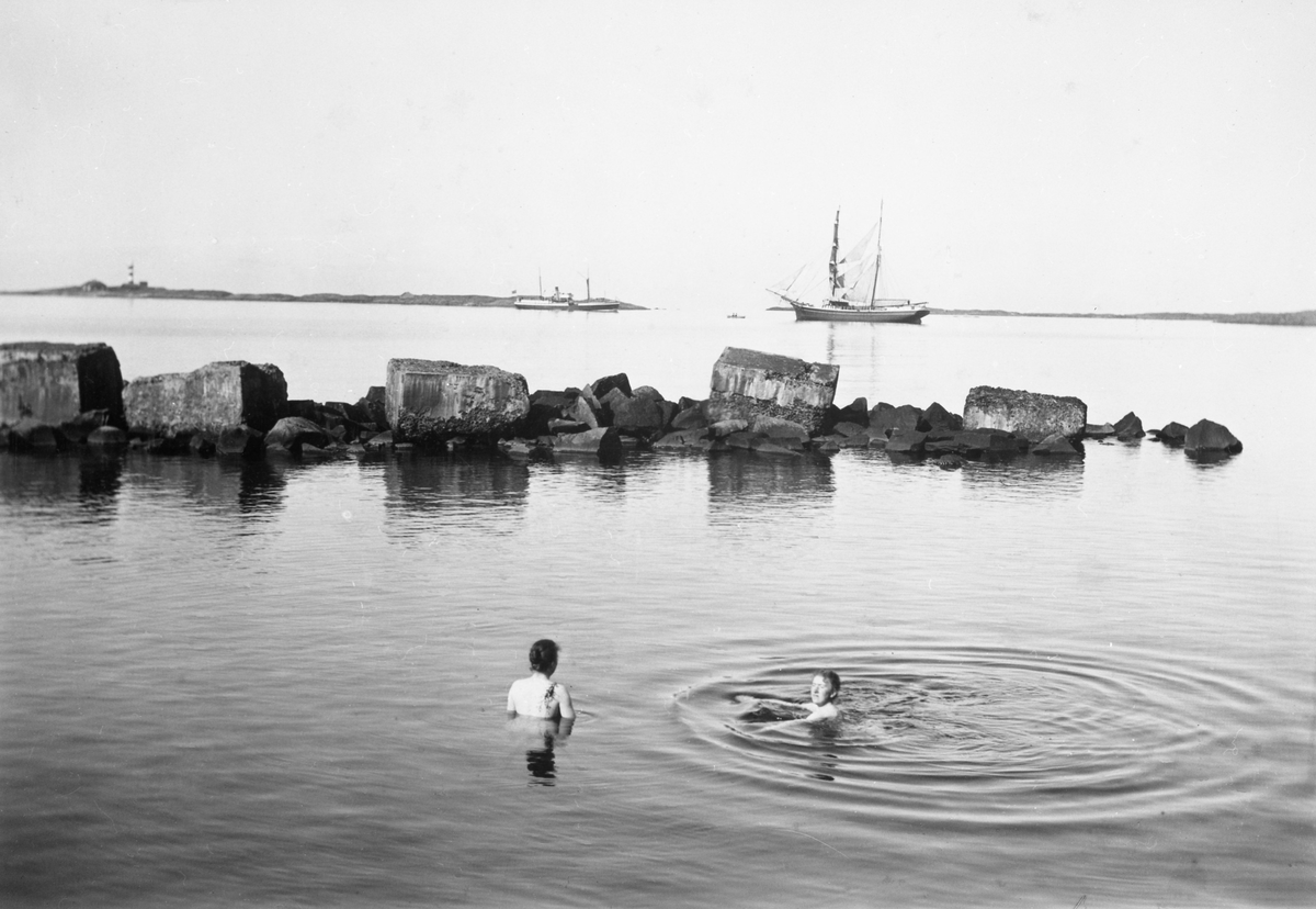 Två badande kvinnor vid Barnens badstrand. I bakgrunden Skrivarklippan med fyren, ett ång- och ett segelfartyg.
