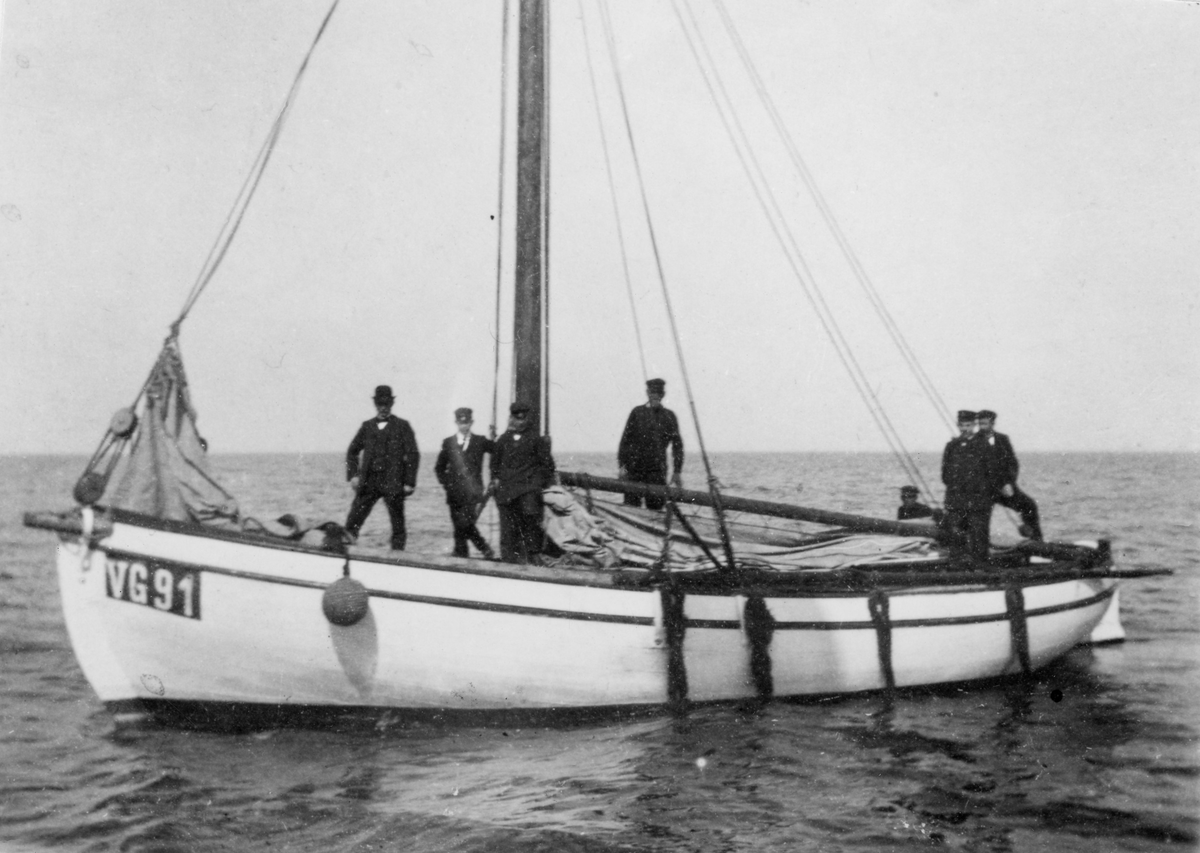 Fiskebåten VG 91 "Ellen" av Varberg med fyrpersonal på väg till Fladens fyrskepp. Foto före 1925.