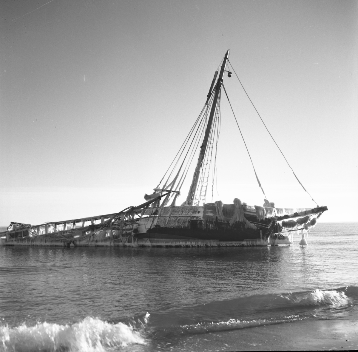 Snöbild av m/s Elin av Vejen som strandade vid Ölmanäs 1952. Ölmanäs krok. Hon var lastad med tegelrör. Skeppet bärgades aldrig utan låg kvar i många år.