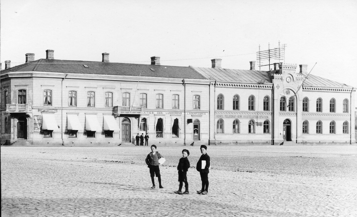 Kvarteret Rådhuset åt torget i Varberg, med hörnet Torggatan-Drottninggatan till vänster. I byggnaden ligger Albert Nelsons manufakturaffär och Dan Lundgrens läderfabrik. I Rådhuset längst till höger finns kongl. telegraf- och rikstelefonstationen inrymd. Fototid: 1910-tal.