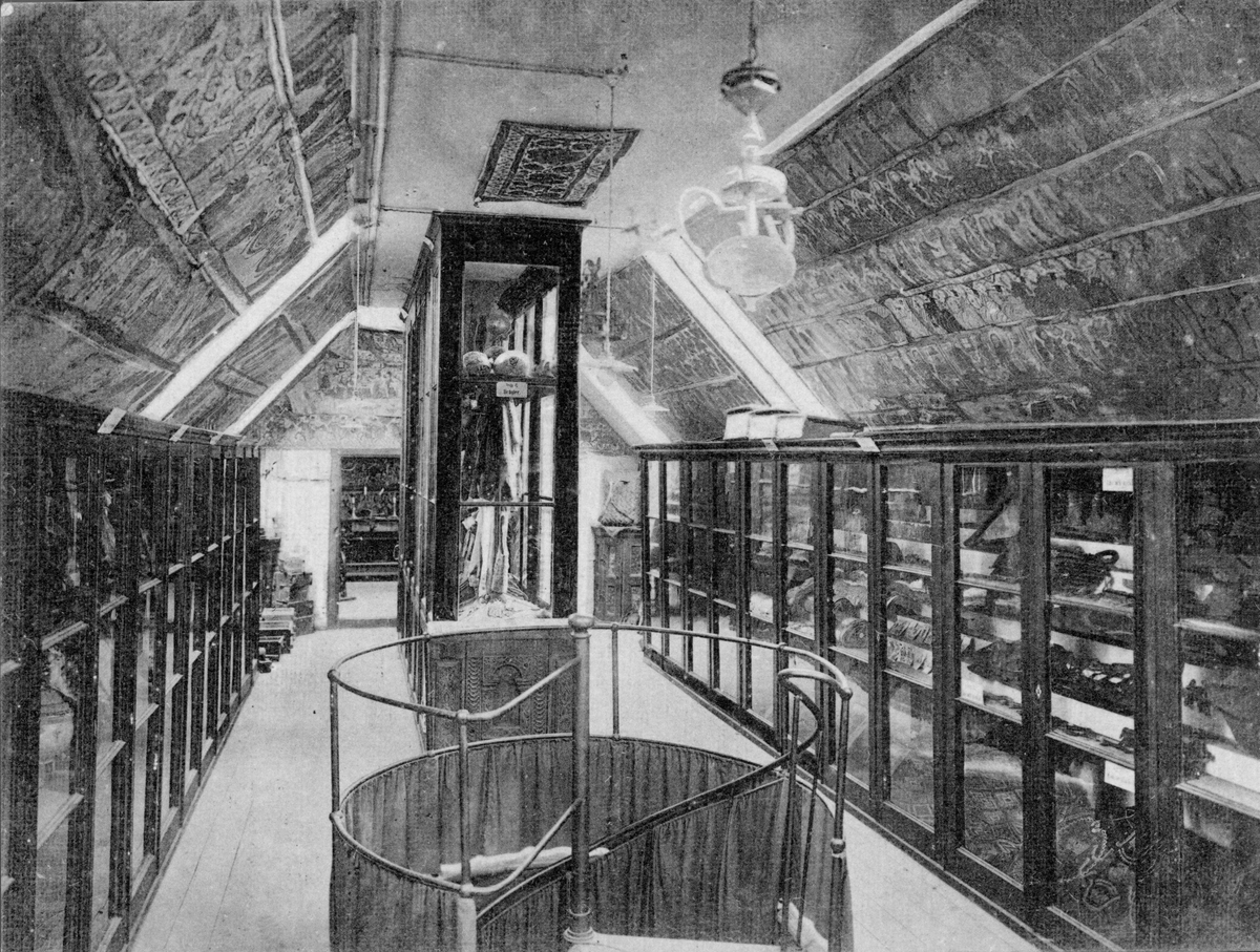 Vykort, "Hallands Museum, Halmstad." med noteringen "i Norreport". Interiör med föremål i montrar, målade bonader i taket och en spiraltrappa i förgrunden.