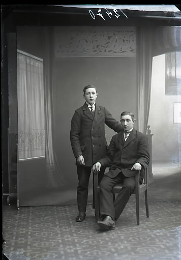 Ateljébild med två unga män i helfigur där den ena sitter. Beställare: Daniel Persson Kvarnarna, Skällinge.