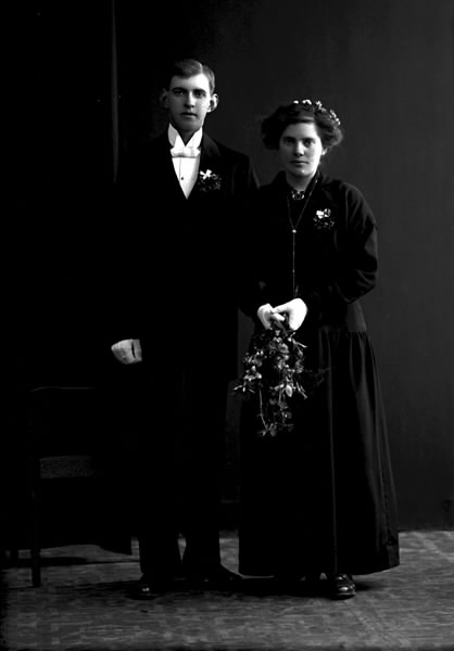 Bröllopsbild, brudparet stående i helfigur. Bruden bär svart och håller buketten framför sig. Beställare: Emil Börjesson, Borekulla Kvarn. (Se även bildnr GB3_50035.)