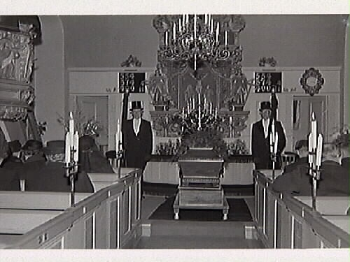 Begravningsgudstjänst i Skällinge kyrka, där kistan flankeras av två prestaver.