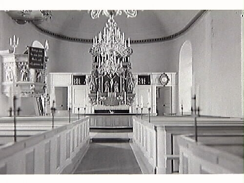 Interiör av Skällinge kyrka. Kor, predikstol, altare, kyrkbänkar.