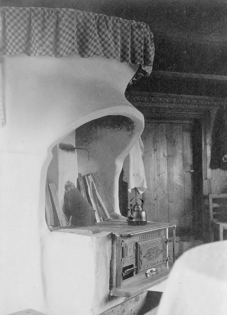 Vedspis (järnspis) och spiselvalv med uppsvängd kåpa, Häljagård, Frillesås. Upptill sitter ett veckat tyg i rutigit sparlakansmönster. Interiör från kök 1923.