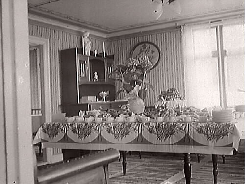 Festligt dukat kaffebord med en stor hortensia i mitten. Salongen har en kraftig, målad taklist och dekorationsmålning längs takkanten. Förmodligen i Rolfstorp eller Skällinge som var fotografens hemvist.
