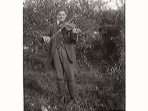 Ragnar Bengtsson, (grundare till firman Köksplaneringen) står i Hallagårds trädgård och spelar fiol.