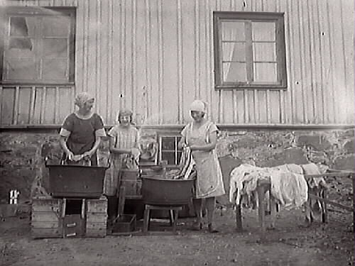 Klädvård. Tvättning av kläder utomhus på Hallagård. Kvinnorna som tvättar är fr v Ebba Larsson, Alice Andersson och Ester Stener. Se E7144, foto från samma tillfälle.